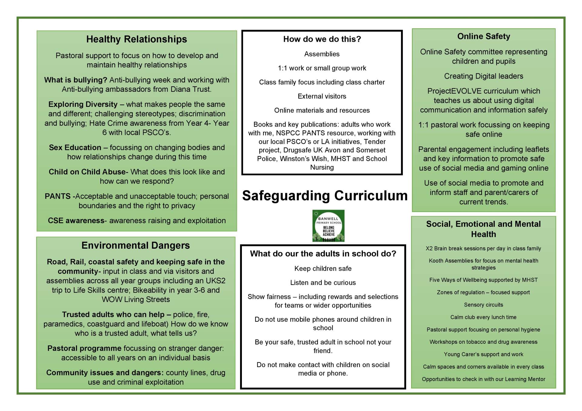 There is a planned curriculum for safeguarding. This teaches your children how to keep themselves safe and what to do if any adult makes them feel unsafe.