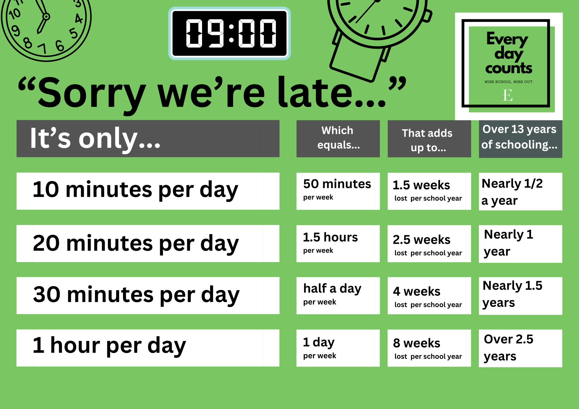 We are committed to encouraging children to attend school regularly and on time. Research shows that there is a direct link between good attendance and achievement in school. Poor attendance can have a direct effect on attainment and future life chances. It is vital that good habits start when children are young.